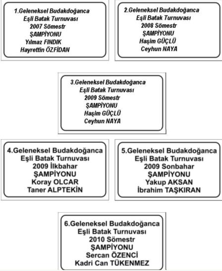 8-) ÖDÜL: Eşli batak oyununda köyümüzün en iyisi olma şerefine nail olarak kazanılacak olan prestij ve Organizasyon komitesince önceki yıllar şampiyonlarının yanına asılacak ŞAMPİYONLUK PLAKETİ dir.Ayrıca Kahvehane sahibi İBRAHİM TAŞKIRAN tarafından ŞAMPİYON takım oyuncularına birer adet DVD PLAYER hediye edilecektir.