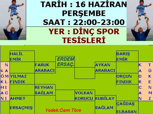 Babalar takımını Erdem Ersaçmış-Ahmet Ersaçmış ve Cem Töre gibi gençlerle takviye ederken farkında olmadan çok isabetli bir iş yaptığımızı daha maçın başında anladık…Çocuklar takımından bir oyuncunun maça gelmemesi (haber vermeden) Babalar takımında devre arası oyuncu değişikliğine gidilerek telafi edildi..Bu telafi yönteminden ilk yarıda pili biten Reyhan Hocanın büyük bir gönüllükle faydalandığını gözledik…