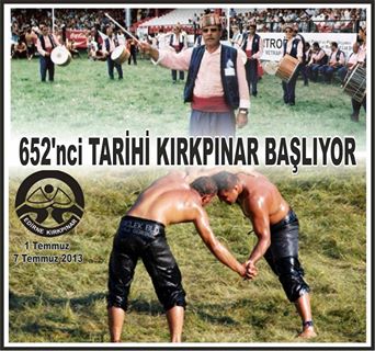 YİĞİTLERİN BULUŞMASI 5 TEMMUZ'DA 5 Temmuz 2013 Cuma günü de büyük buluşma gerçekleşecek. Sabah saat 09.00'da 652'nci Tarihi Kırkpınar Yağlı Güreşleri başlayacak. Saat 10.00'da Kırkpınar Ağası'nın Edirne Belediye Başkanlığı önünde karşılanacak. Yağlı Güreş açılış korteji belediye önünden Atatürk Anıtı'na yürüyecek. Anıtta çelenk sunumu, saygı duruşu ve İstiklal Marşı'nın söylenmesinden sonra Kırkpınar Marşı okunacak. Kortej pehlivanlar Mezarlığı'nı ziyaret edecek, çelenk bırakacak, dualar edecek. Saat 12.00'da Selimiye Camii'nde mevlüt okutulacak.