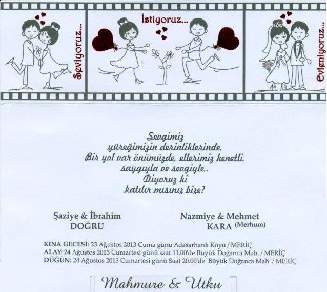 Nazmiye (Emir) KARA ablamızın oğlu Utku Evleniyor.Düğün için 24 Ağustos 2013 Günü Saat 16:00 da Eski Bağkur Sokağından Araç kalkacaktır. |
