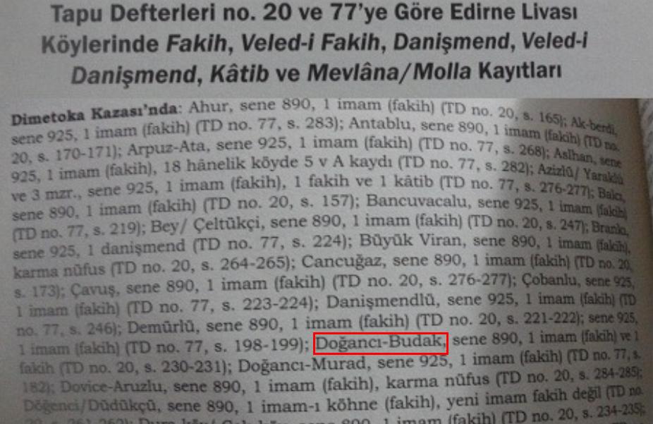 "Doğancı-Budak, sene 890, 1 imam (fakih) ve 1 fakih (TD no. 20 , s. 230-231)"