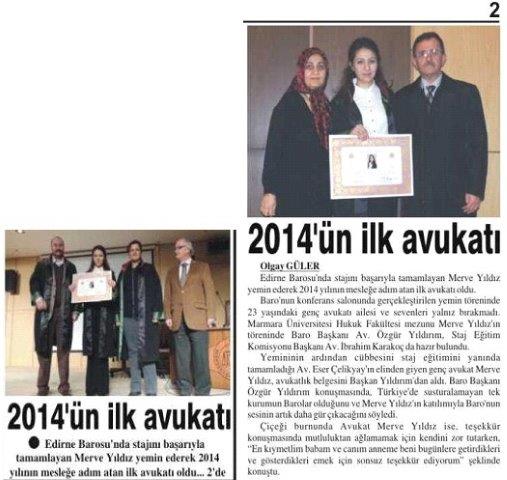 Köyümüz halkından Tacettin&Aynur çiftinin kızı Av. Merve YILDIZ , Edirne Barosu'nda stajyerliğini tamamlayarak yemin etti. Merve, Avukatlık Belgesini Baro Başkanı Av.Özgür Yıldırım'ın elinden aldı ve cübbesini de Av.Eser Çelikyayla'nın elinden giydi. Merve Yıldız böylece 2014 yılında mesleğe başlayan ilk avukat oldu.