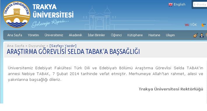 T.Ü Rektörlüğünden Selda TABAK'a Anlamlı Mesaj