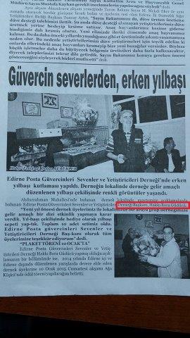 Köylümüz Bora Güdücü 'nün başkanlığını yürüttüğü Edirne Posta Güvercinleri Sevenler Derneği dernek lokalinde düzenlediği erken yıl başı partisinde dernek yararına yapılan çekilişte çeşitli hediyeler dağıtıldı.Yerel basının yoğun ilgi gösterip geniş yer verdiği programa emeği geçenleri kutluyoruz.