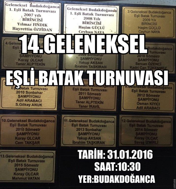14.Geleneksel Batak Turnuvası 31 Ocak 2016 tarihinde Budakdoganca Köyünde yapılacaktır. Bu yıl katılımın çok yüksek olacağını tahmin ettiğimiz turnuvada, mekan darlığı sebebi ile en fazla 26 takımın katılımı mümkün olacaktır. Turnuvaya katılmayı düşünen ekiplerin bir an önce kayıt olmasını öneririz.
