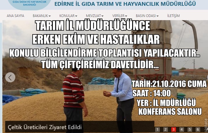 Edirne İl Gıda Tarım ve Hayvancılık Müdürlüğünce 21 Ekim 2016 Cuma günü Saat 14:00 te İl Müdürlüğü Konferans Salonunda Erken Ekim ve Hastalıklar konulu Bilgilendirme Toplantısı yapılacağı muhtarlığımıza bildirlmiştir.