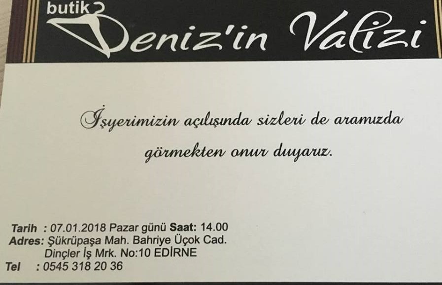 Çağan Emir ve eşi Deniz'in birlikte işletecekleri "Butik Deniz'in Valizi" , 07.01.2018 Pazar günü saat 14:00'da açılıyor. Açılışa tüm köy halkımız davetlidir.