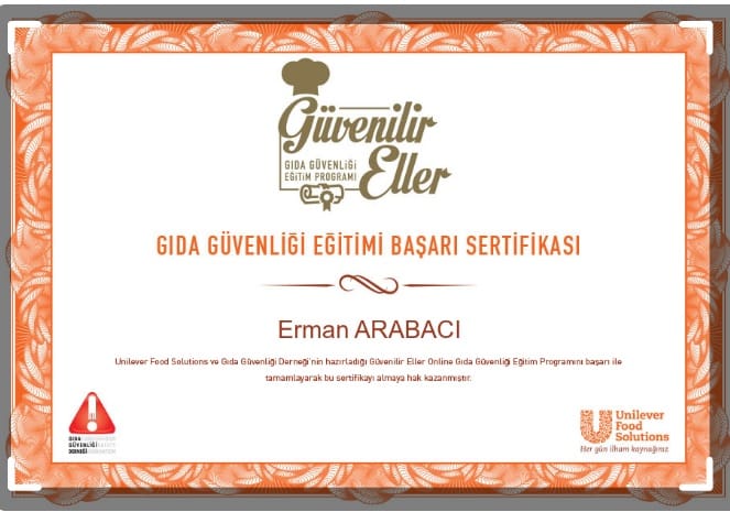 Arıcılık sektörüne merak salan ve son yıllarda bu alanda çeşitli başarılara imza atıp bal ve diğer ürünlerin üretimi ve pazarlaması konularında çeşitli eğitimlere katılı çok sayıda belge ve sertifika sahibi olana Erman ARABACI bu defa katıldığı eğitimde GIDA GÜVENLİĞ SERTİFİKASI almıştır.