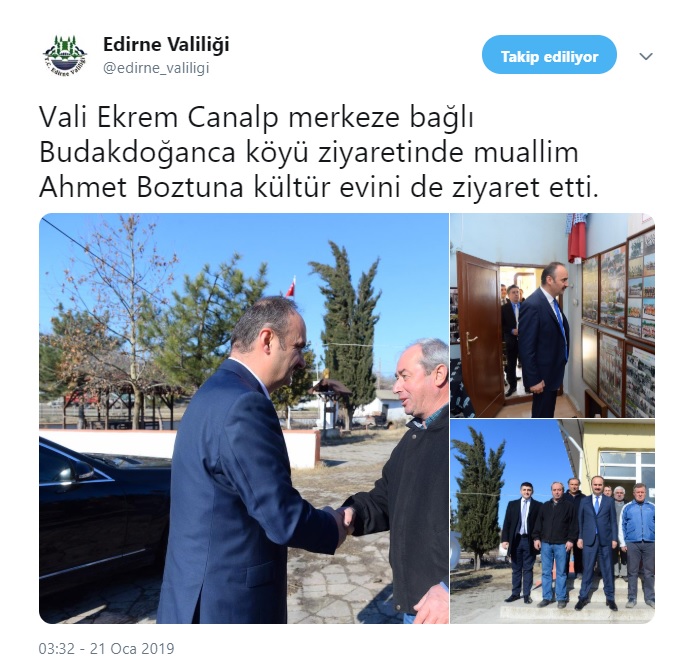 Sayın Valimiz Ekrem CANALP köyümüzü ziyaret etmiş ve köyümüz hakkında bilgiler almıştır.Köyümüzün Ahmet BOZTUNA Kültür Evi'ni de ziyaret eden Sayın Valimize tüm köy halkım adına şükranlarımı sunarım.