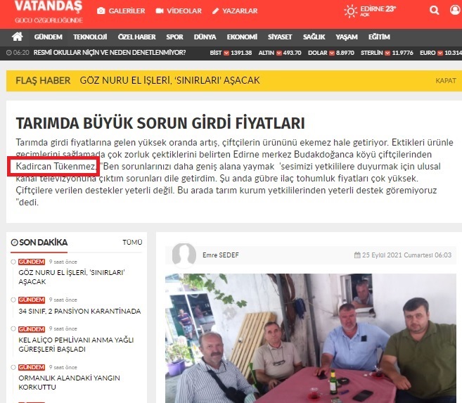 Son dönemlerde çiftçilerimizin yaşadığı sorunları her platformda dile getiren genç çiftçilerimizden K adrican TÜKENMEZ TELE1 Televizyonu ekranlarında verdiği demeçten sonra bu defa yerel basınımızda VATANDAŞ Gazetesine verdiği demeçte çiftçilerimizin sorunlarını dile getirmiştir.