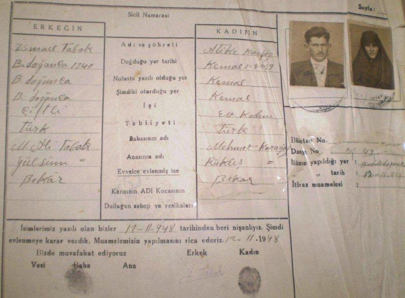 Sayın Budakdoğancalılar; Köy Muhtarlığında yaptığımız araştırmada 2 adet Köy Evlenme Kütüğü bulduk. Bu kütüklerde nikahları köy muhtarlığınca kıyılan kişilerin fotoğrafları ,evlenme tarihleri mevcut. Evlenme Kütüklerinin 1.cisinde ilk nikah 1948 yılında kıyılmış. Muhtemelen bunlardan önce de bir evlenme kütük defteri olması gerek. Bu yaz muhtarlık arşivinde yapacağımız çalışmada o kütüğü de ortaya çıkarmaya çalışacağız. Örnek olsun diye şimdilik bulduğumuz 1.ci defterdeki ilk nikahı yaptıraran 1.ci sıradaki İsmail-Atike TABAK çiftinin nikah belgesini yayınlıyoruz. Nikahı, Muhtar Mustafa VATAN tarafından kıyılmıştır. Daha sonra nikahı Köy Muhtarlığınca kıyılan tüm köylülerimizin nikah belgelerini sitemizin alt menüsünde kalıcı olarak yayınlayacağız. Bu belgeyi örnek olarak sunduk. İlk deftere ulaşabilrisek daha güzel şeyler ortaya çıkacak. Bu defterlerde de ilginç kişilikleri göreceksiniz, bu kişi de bizim köylü mü? diyeceksiniz. Bilgilerinize sunulur. SİTE YÖNETİMİ