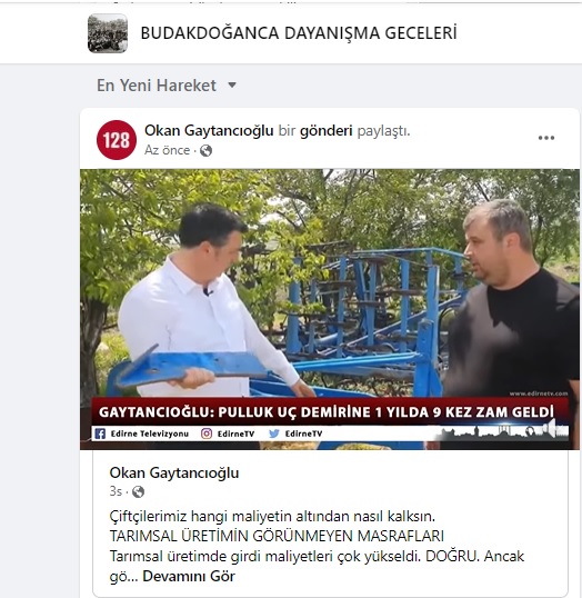 İlk zamanlar Dayanışma Gecelerimizin fotoğraflarını paylaşmak için kurduğumuz ancak zamanla büyüyen yaklaşık 1000 kişilik üye sayısına ulaşan ve Facebook Platformunda BUDAKDOĞANCA DAYANIŞMA GECELERİ adı ile yer alan grubumuzda Edirne Millet Vekilimiz Sayın Okan GAYTANCIOĞLU köyümüzün genç ve başarılı çiftçilerinden Kadri Can TÜKENMEZ ile çiftçi maliyetlerinin görünmeyen giderleri konulu söyleşisini paylaşmıştır.