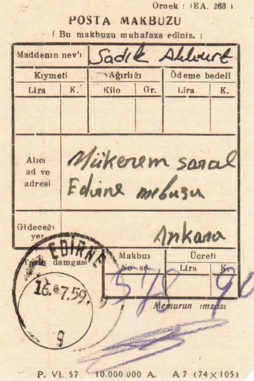 Muhtar Sadık AKKURT'un 16/07/1959 tarihinde Edirne Milletvekili Mükerrem SAROL'a gönderdiği mektubun Posta Alındı Makbuzudur. Bu belge Evlenme Kütüğü Defterinin içinde bulunmuştur. Sitemizin Tarihi Belgeler Bölümüne eklenecektir.