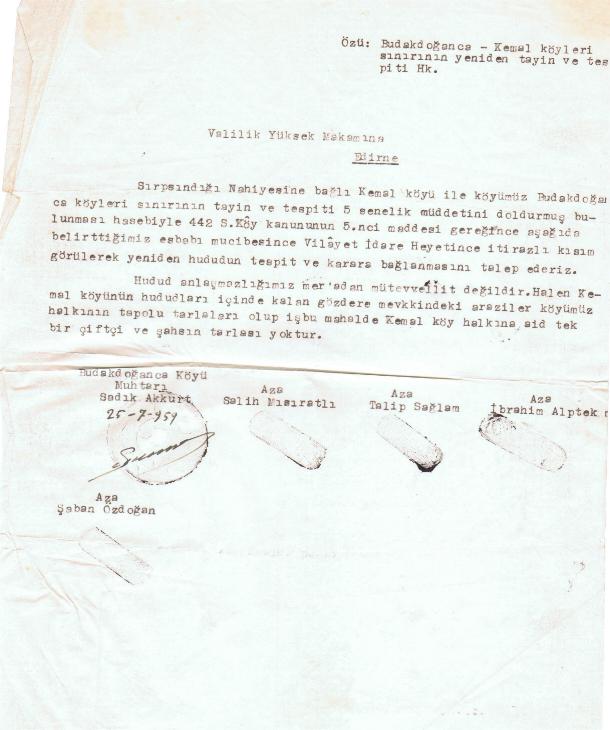 Budakdoğanca-Kemal Köy arasındaki sınırın yeniden tespiti için dönemin muhtarı Sadık AKKURT, aza Salih MISIRATLI, aza Talip SAĞLAM, aza İbrahim ALPTEKİN, aza Şaban ÖZDOĞAN imzalı dilekçe, 25.07.1959 tarihinde Valilik Makamına sunulmuş. Bu belgeyi de Evlenme Kütük Defterinin içinde bulduk. Aynı zamanda dilekçe yarın yayınlayacğımız Posta Makbuzu ile Edirne Mebusu Mükerrem SAROL'a da gönderilmiş. Yukarıdaki dilekçe Tarihi Belgeler Bölümünde de yayınlanacaktır.